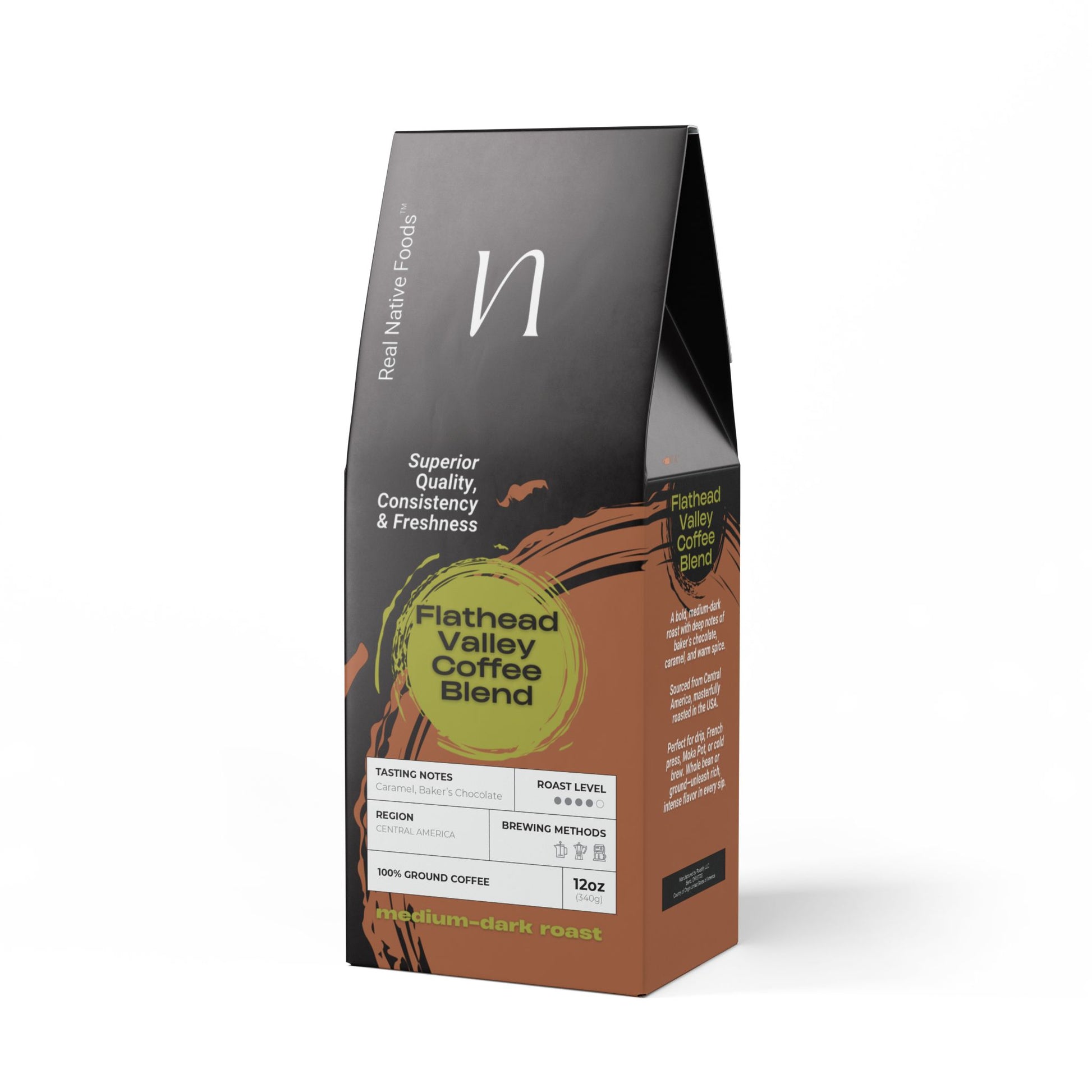 Meet the Flathead Valley Coffee Blend, a bold and rich brew to kickstart your day! This 12oz pack features a medium-dark roast, delivering a deep body with notes of baker's chocolate and caramelized sugar. Meanwhile, the body tastes rich with warm spice, caramel, and dark chocolate-tasting notes that'll leave you craving more. Sourced from Central America, it's perfect for brewing in your drip coffee maker, French press, Moka Pot, or percolator, or enjoying as a refreshing cold brew. Whether you prefer whole bean or ground, we've got you covered. Roasted with care right here in the USA.
