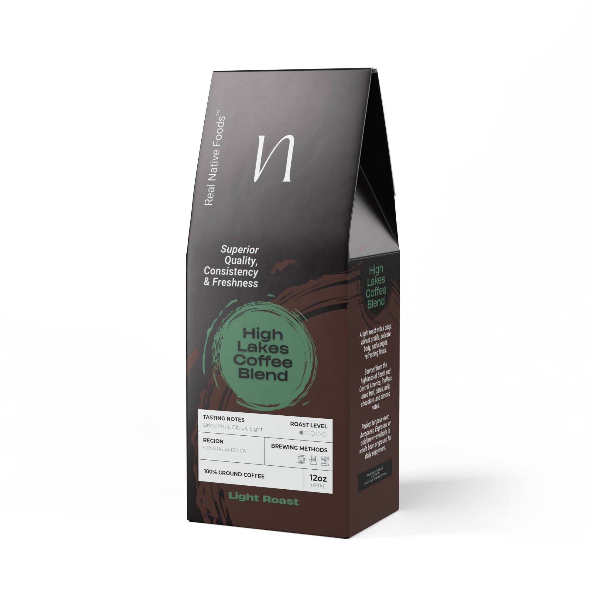 The High Lakes blend is a light roast from South and Central America that is perfect as a daily staple thanks to its light body. Each cup comes with dried fruit and citrus flavors with hints of milk chocolate and almonds. Perfect for pour-over, Aeropress, Espresso, or a delightful cold brew. Available in 12oz packs of whole bean and ground options. Roasted in the US from globally sourced ingredients.