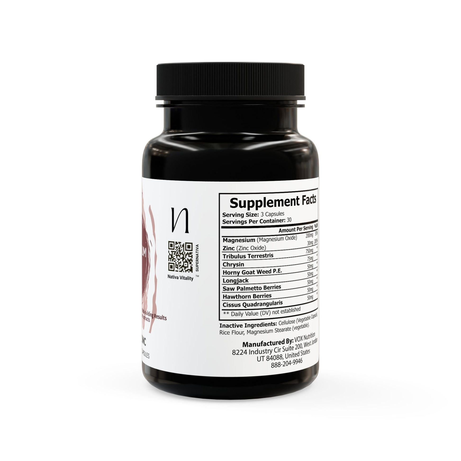 Ingredients: Magnesium (Magnesium Oxide), Zinc (Zinc Oxide), Tribulus Terrestris, Chrysin, Horny Goat Weed P.E., Longjack, Saw Palmetto Berries, Hawthorn Berries, Cissus Quadrangularis. Inactive Ingredients: Cellulose (Vegetable Capsule), Rice Flour, Magnesium Stearate (vegetable).