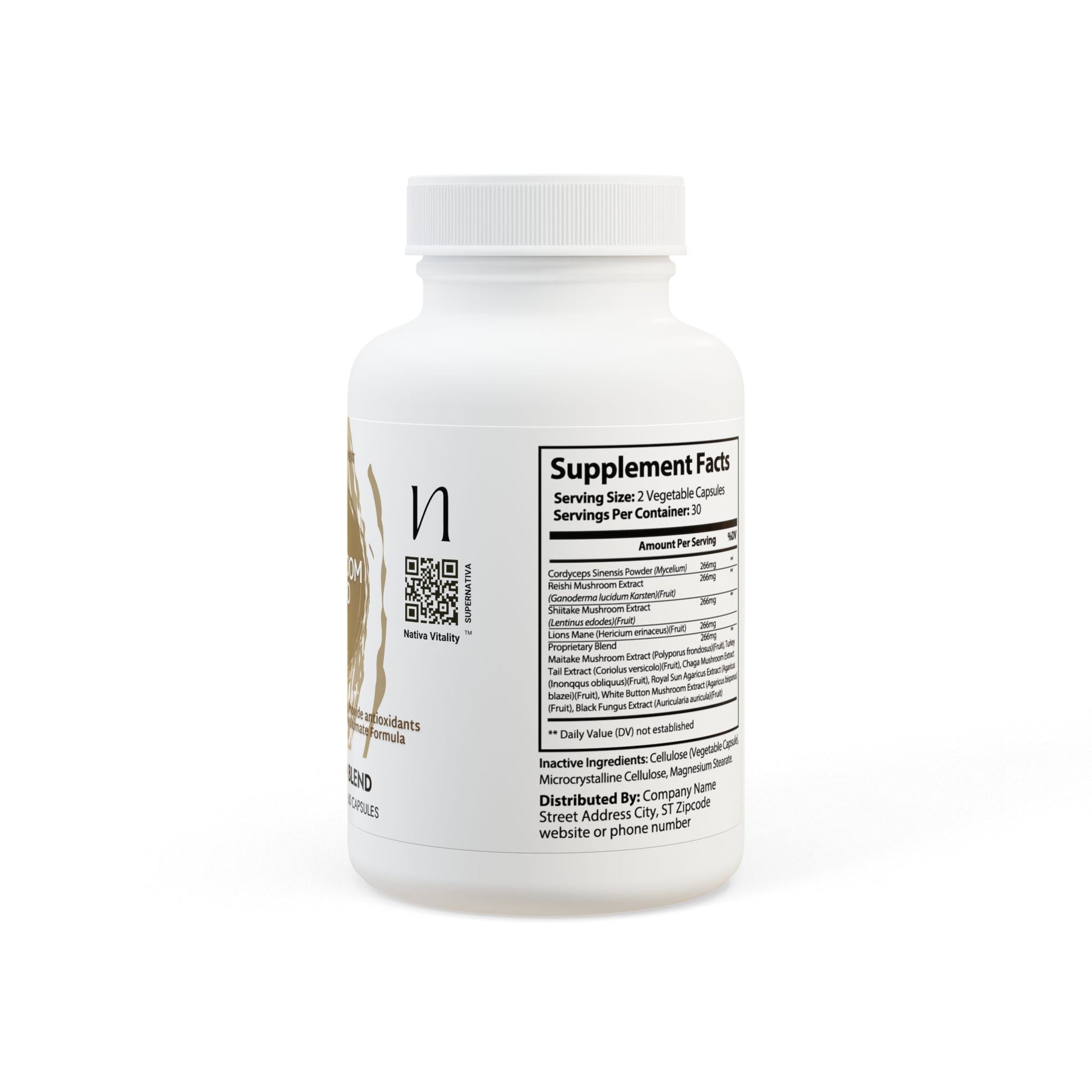 Cordyceps Sinensis Powder (Mycelium), Reishi Mushroom Extract, (Ganoderma lucidum Karsten)(Fruit), Shiitake Mushroom Extract, (Lentinus edodes)(Fruit), Lions Mane (Hericium erinaceus)(Fruit), Proprietary Blend, Maitake Mushroom Extract (Polyporus frondosus)(Fruit), Turkey Tail Extract (Coriolus versicolor)(Fruit), Chaga Mushroom Extract, (Inonqqus obliquus)(Fruit), Royal Sun Agaricus Extract (Agaricus blazei)(Fruit), White Button Mushroom Extract (Agaricus bisporus), (Fruit), Black Fungus Extract (Auricularia auricula)(Fruit), Cellulose (Vegetable Capsule), Microcrystalline Cellulose, Magnesium Stearate.