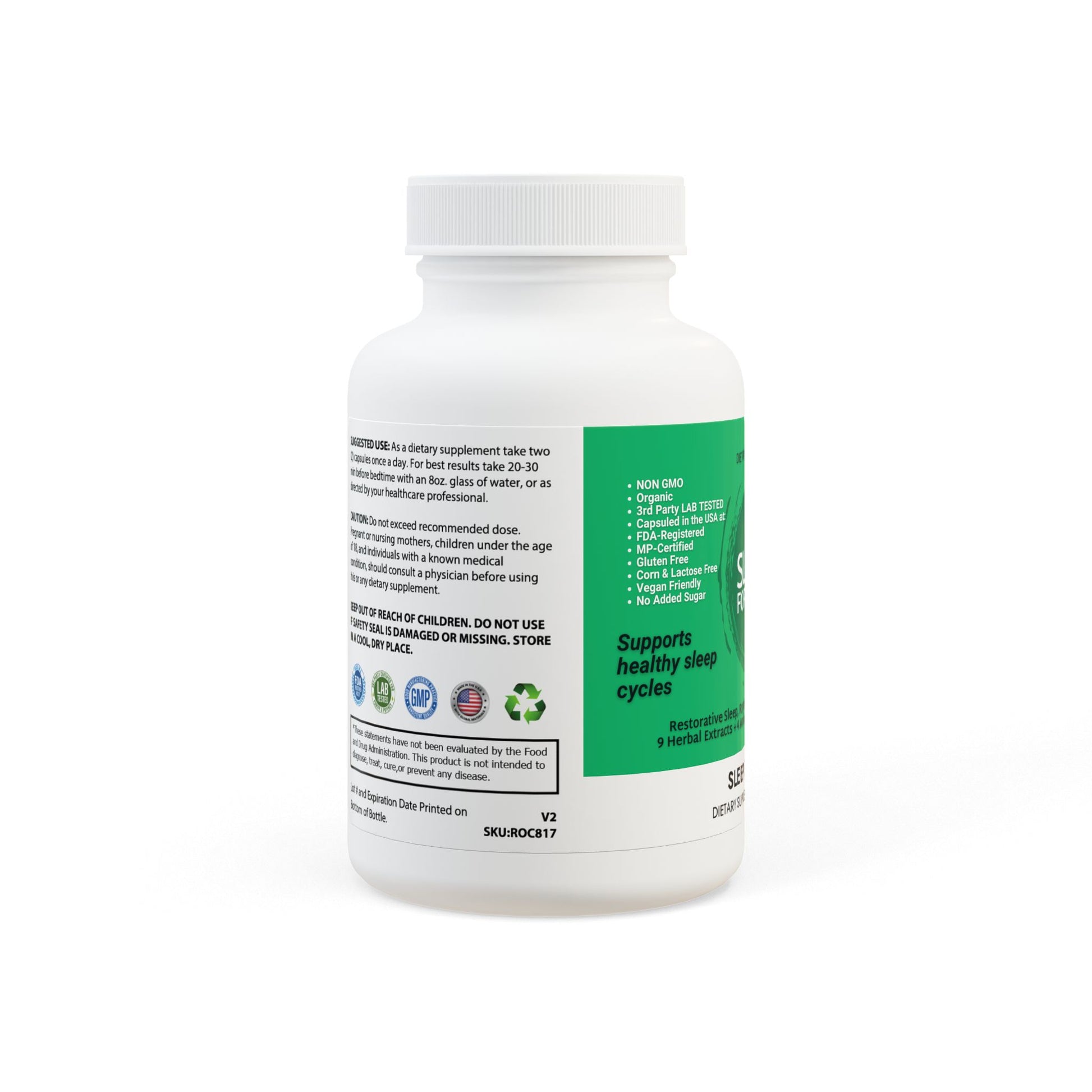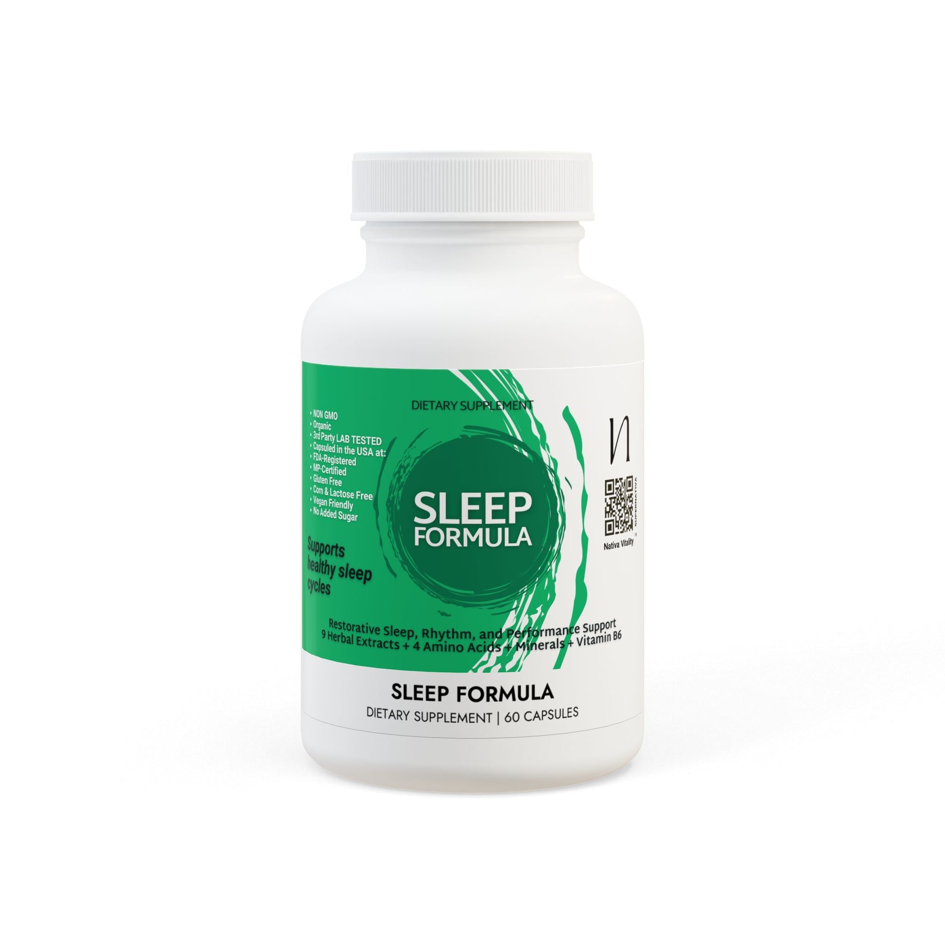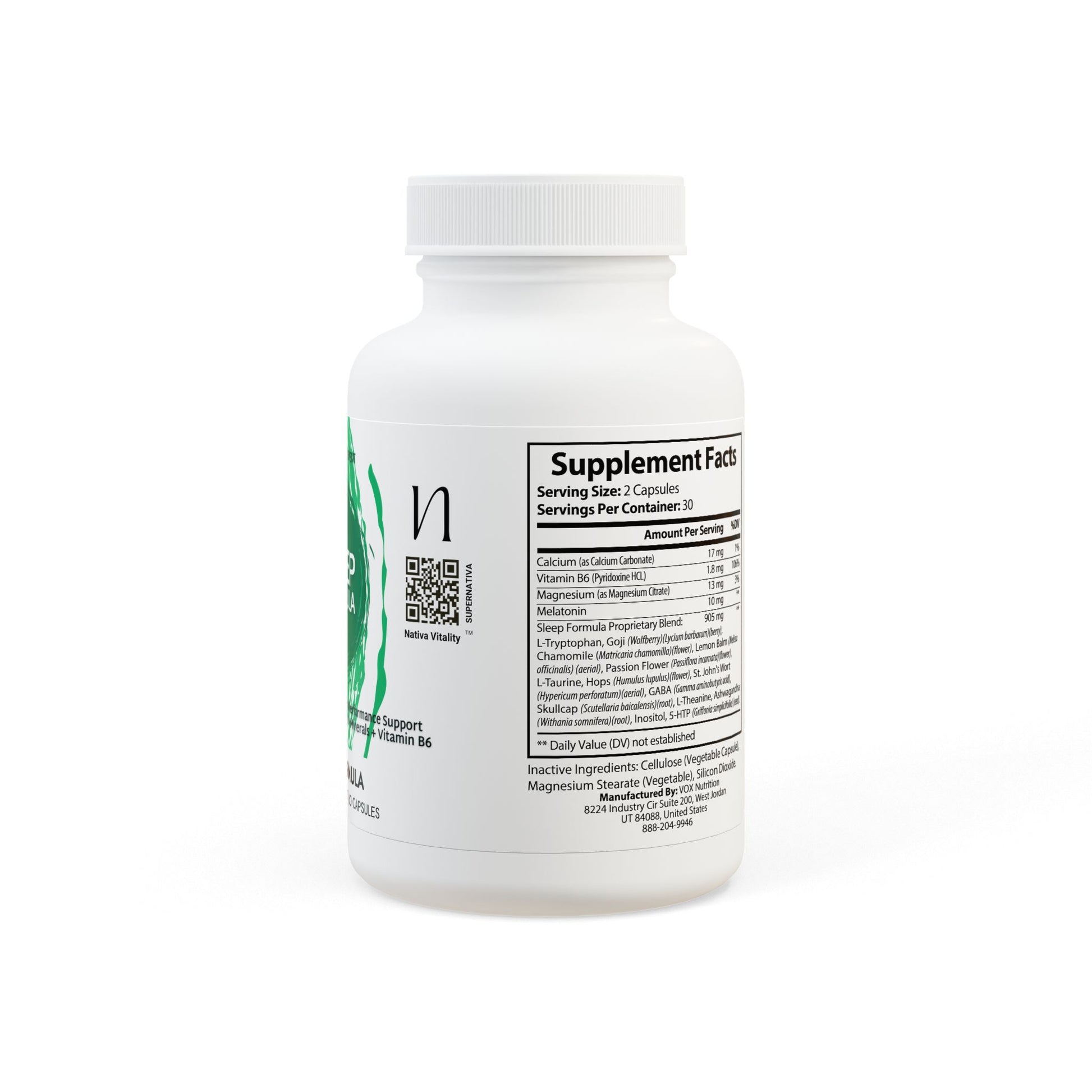 Calcium (as Calcium Carbonate), Vitamin B6 (Pyridoxine HCL), Magnesium (as Magnesium Citrate), Melatonin, Sleep Formula Proprietary Blend: L-Tryptophan, Goji (Wolfberry)(Lycium barbarum)(berry), Chamomile (Matricaria chamomilla)(ower), Lemon Balm (Melissa ocinalis) (aerial), Passion Flower (Passiora incarnata)(ower), L-Taurine, Hops (Humulus lupulus)(ower), St. John's Wort (Hypericum perforatum (aerial), GABA (Gamma aminobutyric acid), Skullcap (Scutellaria baicalensis)(root), L-Theanine, Ashwagandha (Withania somnifera)(root), Inositol, 5-HTP (Grionia simplicifolia) (seed).